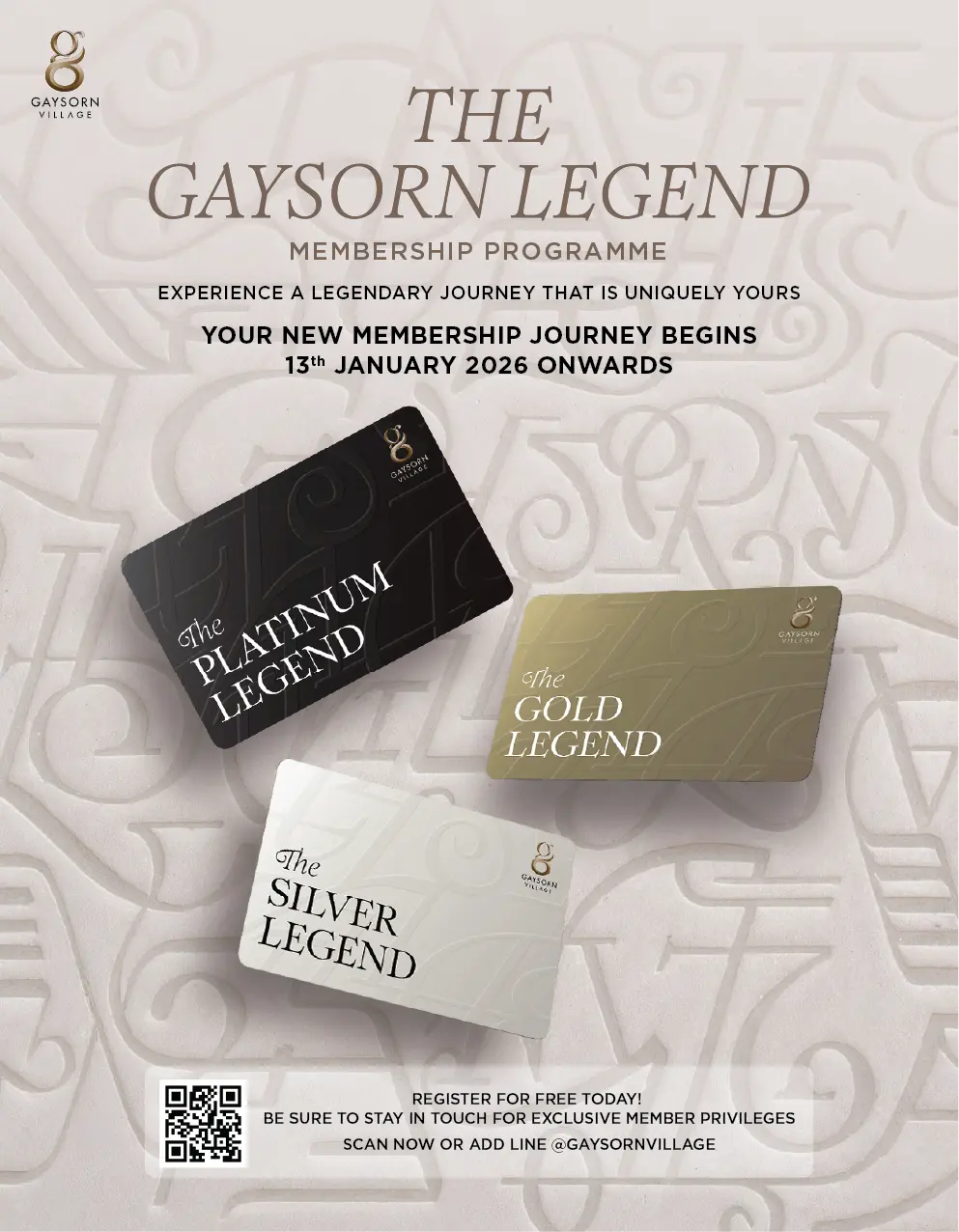 No additional registration is required. Your membership will automatically transfer to the new The Gaysorn Legend, reflecting your spending at Gaysorn Village from 12 January 2025 to 12 January 2026.